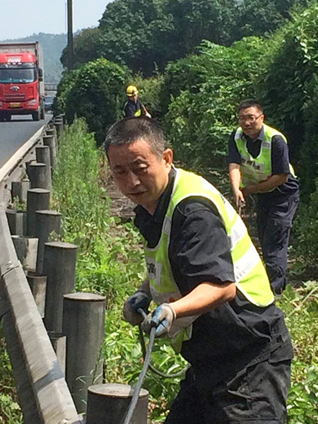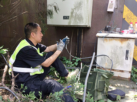 圖為修復后的隧道口路燈 對于修復被盜電纜,一般最直接的做法是重新再拉一根新電纜至配電箱,利用箱內現(xiàn)成的控制開關和交流接觸器等元器件,完成整個電纜連接工作,但中心隊員考慮到此種方法不僅工作量大,修復成本高,而且存在再次被盜的可能性,如果用鋁線代替,電力傳輸又要大打折扣。于是,他們另辟蹊徑,計劃從剩余配電箱至路燈還有200余米未被盜取的電纜中截取一段,直接和洞口情報板電纜相接,這樣既能節(jié)省人力、物力,又能以最快速度恢復路燈正常工作。 當天一早,中心隊員帶上相應的工具和設備直奔現(xiàn)場,在確認電纜位置及走向后,便著手抽離洞內電纜??紤]到洞口到配電箱電纜至少有100余米,電纜溝下面又鋪有其他眾多電纜以及之前掉落的垃圾,直接從洞口抽離根本無法動彈。于是,中心4名隊員便每隔10米左右用撬棍撬開上面水泥蓋板,整個人跳進電纜溝內,彎著腰一段一段抽離。抽到最后一個溝時,4人頂著烈日,齊力把重達近百斤電纜抽離整個電纜溝并放置在護欄內側草地上,隨后再從抽出的這段電纜中剪取適當長度,重新鋪設后與寧向出洞口的情報板電纜相接。 臨近中午,戶外溫度不斷升高,中心隊員早已濕透衣背,為趕在一天中最熱的時間點前完成任務,4名隊員臨近解決午餐又迅速奔赴現(xiàn)場,拆除原配電箱內的舊器件,將其用回到新的供電線路中,而多余的器件則捆綁打包帶回中心以留備用,節(jié)省公司后期維養(yǎng)成本。 下午1:40,經(jīng)過通電測試,9盞路燈全部恢復正常工作。集團總工程師江輝在工程部微信群里肯定了中心工作,并提醒一線人員切記做好防暑降溫工作,注意自身身體狀況。
