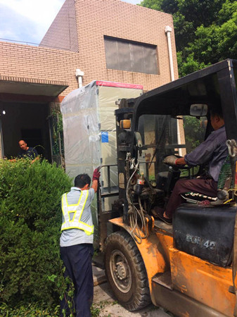 圖為工作人員正在搬運(yùn)配電柜