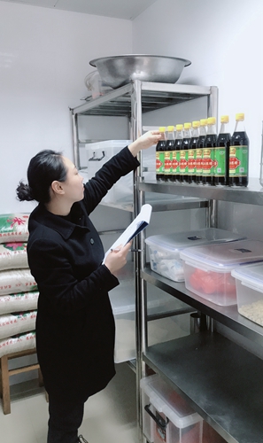 圖為工作人員檢查食堂用品 此外,工作人員每周將不定期對(duì)食堂內(nèi)外環(huán)境、倉(cāng)庫(kù)存儲(chǔ)擺放、操作間衛(wèi)生情況、餐飲具消毒清洗、從業(yè)人員采購(gòu)登記、一日三餐留樣制度等進(jìn)行檢查,并制定員工就餐登記要求,提前登記用餐人數(shù),改變以往不就餐又不打招呼的現(xiàn)象,大大減少了不夠吃與浪費(fèi)食材的現(xiàn)象。