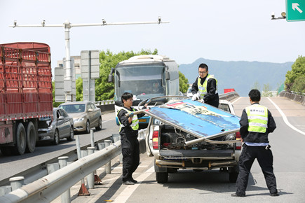 圖為維養(yǎng)中心人員將拆除的廣告牌裝車運離