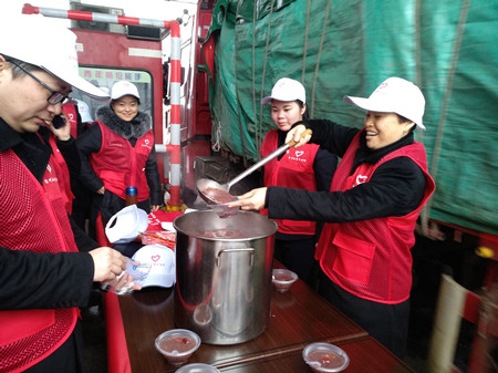 圖為志愿者給司機(jī)送上印有出入平安的“?!弊?/span> 按照傳統(tǒng),臘八節(jié)這天該喝上一碗?yún)R聚著五谷雜糧的臘八粥,可以在冬日暖身暖心,更是對寒冷歲末的美好祝愿。臺州收費所提前幾天就采購好了制作臘八粥的材料:糯米、黑米、薏仁、紅豆、大白蕓豆、蓮子、紅棗、枸杞等,食材足足浸泡了一夜,食堂工作人員從凌晨四點便開始制作,足足熬煮三、四個小時,熬出了四大鍋的臘八粥,出鍋的臘八粥濃稠軟糯、色香味俱佳。 在志愿服務(wù)現(xiàn)場,志愿者們個個身穿統(tǒng)一的紅背心,頭戴白色帽子,面帶微笑,在寒風(fēng)中迎送來往車輛,送上的不僅僅有臘八粥,還有暖心的姜茶,更有溫馨的祝福!