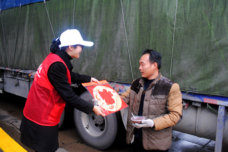 圖為志愿者給過往司機(jī)送上臘八粥