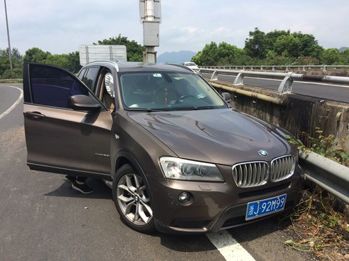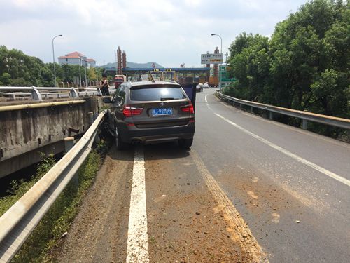 8月13日上午10:30分左右,臺州收費(fèi)所出口寧向匝道口有一輛黑色寶馬X3斜靠在護(hù)欄旁,其車頭左側(cè)因碰撞護(hù)欄而嚴(yán)重凹陷,左前輪胎報(bào)廢。