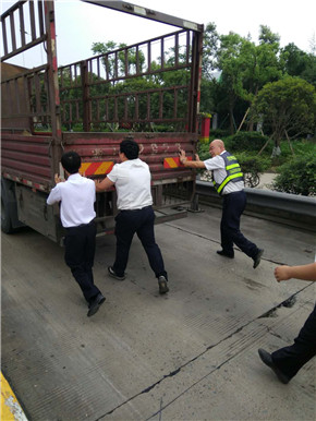湯明漲簡單地詢問了洪燈杰事情的經(jīng)過,本來準備等拖車,可是現(xiàn)在正是中午車輛高峰期,加上五號車道在施工,等拖車不合適。如果導致一號車道堵車,切換ETC也緩解不了??紤]到這些問題之后,湯班長決定叫來幾個“大力士”,幫忙推車。