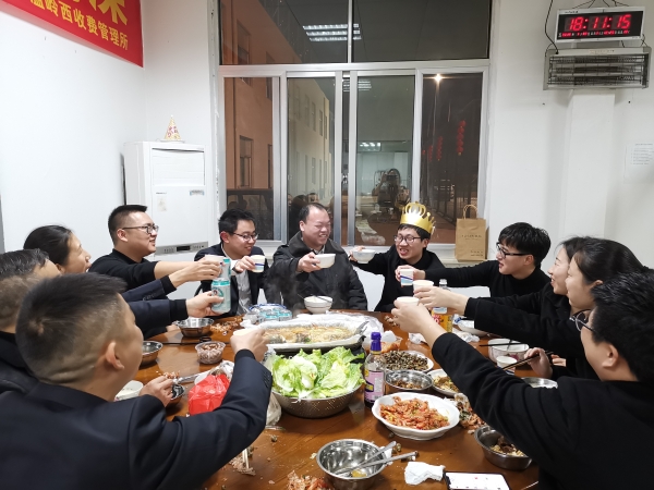 1月30日傍晚,溫嶺西費所二班成員齊聚 在單位食堂,為小壽星洪燈杰舉辦了一場簡單而又有意義的生日宴會。