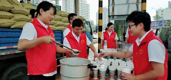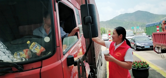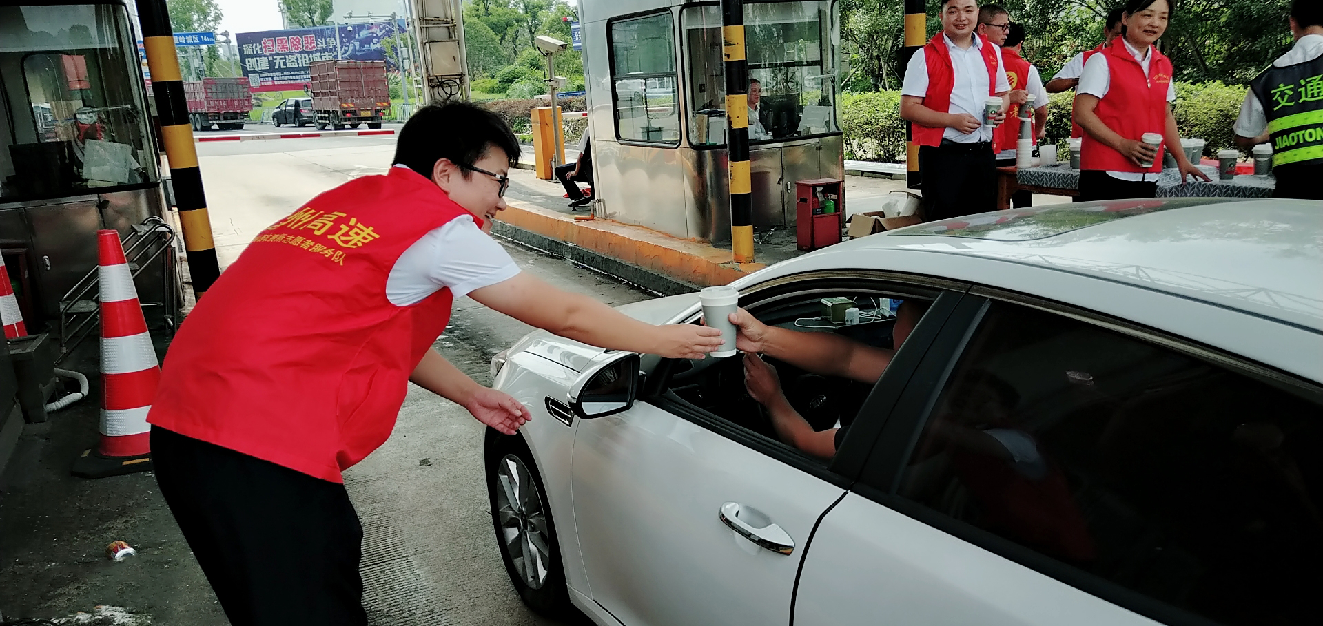 圖為送清涼活動現(xiàn)場 “師傅,你好,喝一碗冰綠豆湯解解暑吧。” 溫嶺西收費所、大溪嶺隧道所黨員帶頭,團員響應(yīng),大家主動放棄休息時間,組成志愿服務(wù)隊,頂著高溫在高速出口處為過往司乘免費提供綠豆湯、紅棗湯等飲品,同時還備足藿香正氣水、風(fēng)油精等解暑藥品,讓廣大司乘在炎炎夏日感受到一絲清涼。當(dāng)司乘人員從志愿者手中接過一杯杯綠豆湯時,志愿者還不忘提醒司乘高溫酷暑天氣注意行車安全。面對“春風(fēng)”般微笑的志愿者,喝著綠豆湯的司乘人員都露出了開心的笑容,紛紛豎起大拇指感謝志愿者們的貼心服務(wù)。