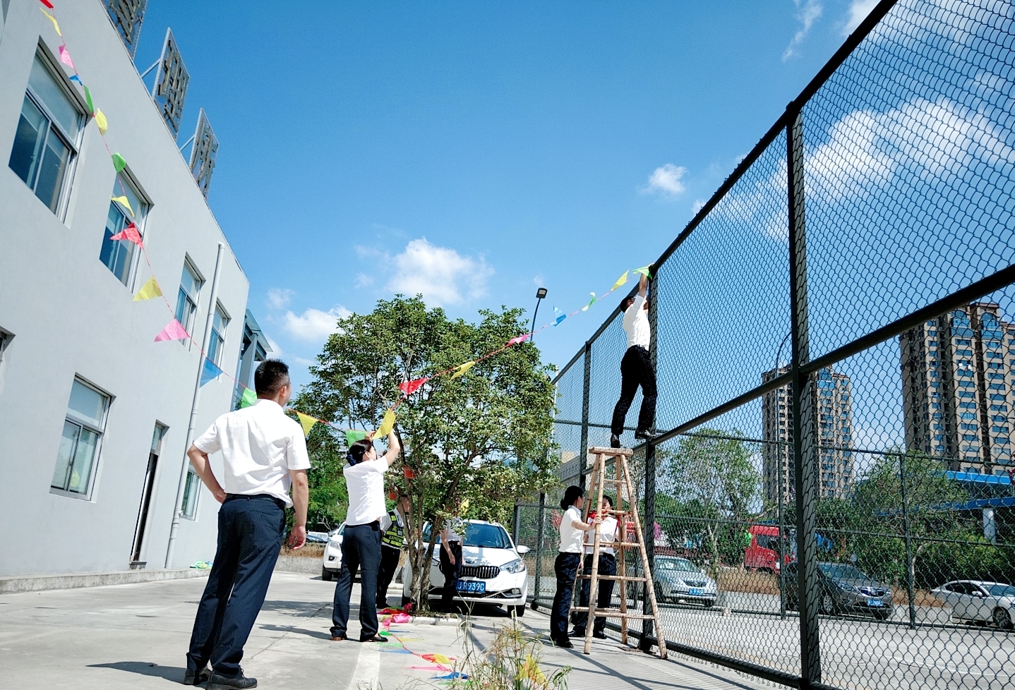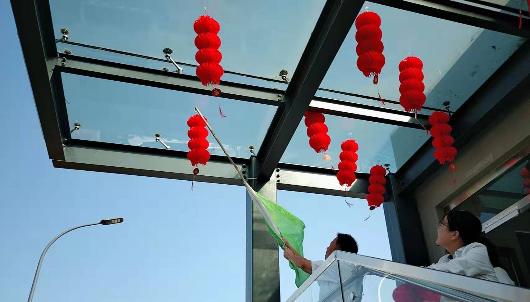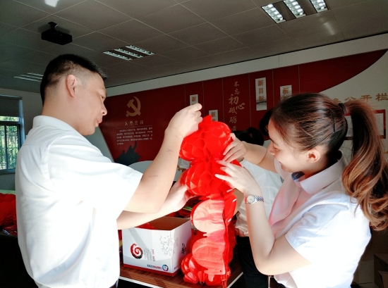 圖為工作人員一起布置收費(fèi)所 在慶祝祖國(guó)70周年生日的日子里,最火的顏色就是紅色。為了弘揚(yáng)中華民族傳統(tǒng)文化,溫嶺西收費(fèi)所后勤組早早購(gòu)置了燈籠、彩旗、五星紅旗,寫好“慶祝祖國(guó)70周年華誕”大字等。黨員帶頭,團(tuán)員緊跟,一線收費(fèi)員紛紛參與,在收費(fèi)站大門口、辦公樓、食堂、宿舍等區(qū)域精心用五星紅旗、大紅燈籠、五顏六色的彩旗裝點(diǎn),一抹抹艷麗的國(guó)旗紅,成為站點(diǎn)最靚麗的風(fēng)景。明亮的黃、鮮艷的紅,美麗窗口突然亮了起來,到處洋溢著濃濃的國(guó)慶氛圍,為過往司乘提供暢、潔、美的節(jié)日行車環(huán)境。 溫嶺西收費(fèi)所后勤組還精心策劃、精細(xì)編排,制作了具有特色、獨(dú)具創(chuàng)意的生日祝福“小視頻”,祝祖國(guó)生日快樂! 通過開展弘揚(yáng)愛國(guó)精神,喜迎國(guó)慶活動(dòng),溫嶺西收費(fèi)所全所工作人員更加不忘初心,砥礪前行,共同慶祝祖國(guó)70周年華誕。 鄭霞霞