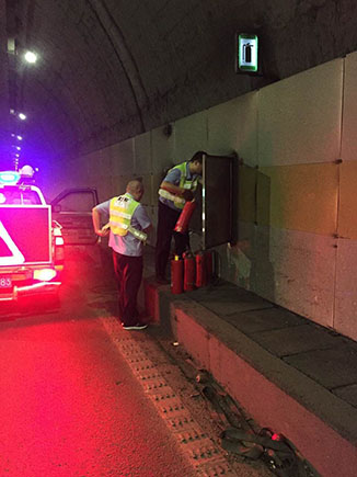 因隧道內車輛往來密集,氣體和灰塵難以散發(fā),容易沉積在隧道壁、監(jiān)控攝像頭及照明燈上形成污漬,此日積月累削弱了隧道內的照明效果,影響駕駛員視線,存在安全隱患。對此,黃土嶺隧道所組織人員對隧道進行清洗和維修保養(yǎng)設備,全面排查各類安全隱患。執(zhí)勤隊利用登高車逐一清潔寧向左洞內監(jiān)控攝像頭及照明燈,檢查消防設施狀況,統(tǒng)一對滅火器進行掛牌完善記錄,并協(xié)同維養(yǎng)中心檢修溫向隧道照明系統(tǒng)線路,修復損壞的燈具。