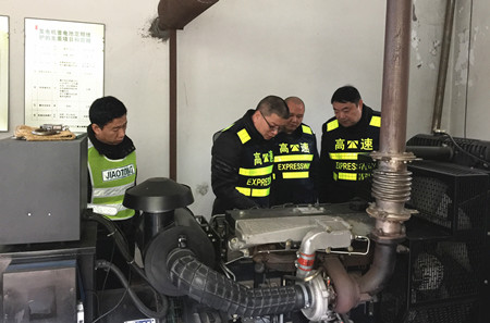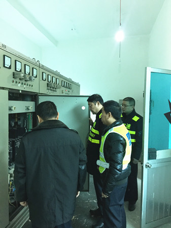 圖為檢查員在檢查配電房用電設(shè)備 檢查人員本著“防范在先、警惕在前”的原則,重點檢查了供配電房的供電設(shè)備運行狀況和消防設(shè)施。在供配電房,大家對環(huán)境衛(wèi)生、發(fā)電機組的機油油位、電柴油儲備量、水箱水位等逐一進行檢查,并當場啟動發(fā)電機組,查看是否能夠有效運行,并仔細檢查了消防設(shè)施生產(chǎn)日期、日常巡查記錄,消防水池儲存水量是否充足等,確保能夠正常使用。