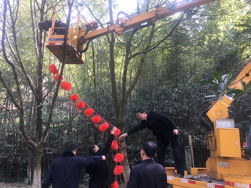 圖為掛好的燈籠 過年掛燈籠是中國古老習俗,紅色代表喜慶,圓形燈籠寓意團圓美滿。該所工作人員利用午休時間自制大紅燈籠750盞,并拿線連成串,大家借來登高車將燈籠掛在綠蔭道兩旁以及公路下方車輛經(jīng)過的地方。遠觀這掛好的燈籠,一片紅火,形成春節(jié)期間一道亮麗的風景線。 一盞盞紅彤彤的燈籠將隧道所裝點得十分溫暖、祥和,注入了濃濃的年味和活力,同時也寄予了大家對新年美好的希望與祝福,希望往來的司機都能接收到這份祝福,過個平安祥和的幸福年。 毛譯聆