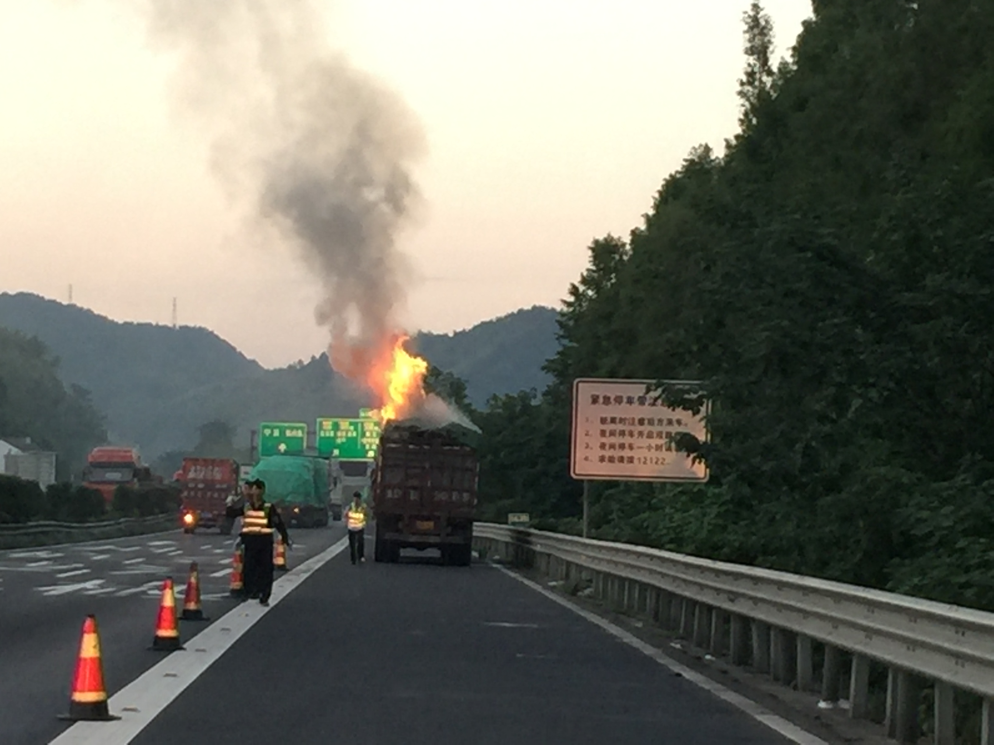 圖為事故現(xiàn)場(chǎng) 險(xiǎn)情就是命令,黃土嶺隧道所執(zhí)勤隊(duì)立即啟動(dòng)火災(zāi)應(yīng)急預(yù)案,迅速帶著滅火器趕赴現(xiàn)場(chǎng)。事故現(xiàn)場(chǎng),貨車車頂冒著火光,而且火勢(shì)越來(lái)越大,滅火器根本不可能撲滅大火。執(zhí)勤隊(duì)又迅速設(shè)置好安全警示標(biāo)志,配合交警人員實(shí)施臨時(shí)交通管制,并對(duì)事故路段的車輛進(jìn)行分流疏導(dǎo)。