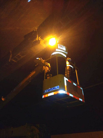 1月31日上午,該所執(zhí)勤隊員在隧道巡邏時發(fā)現(xiàn)溫向快車道一盞照明燈被超高車刮蹭而導致燈罩損壞,燈頭及組件掛落蕩在橋架下,很容易造成二次事故而引起人員傷亡。一發(fā)現(xiàn)該隱患,隊長李新波立即向所長李立巍報告險情,馬上聯(lián)系高速交警、指揮中心人員,要求立即封道搶修。 大溪嶺隧道所在險情發(fā)生的第一時間作出緊急措施,兩名執(zhí)勤隊員在溫向隧道洞口卡口預警,李立巍向維養(yǎng)中心調(diào)來登高車,三名電工隨即進隧道維修脫落的燈罩。經(jīng)過25分鐘的快速搶修,目前設備已能正常使用,隧道恢復通行。 李新波