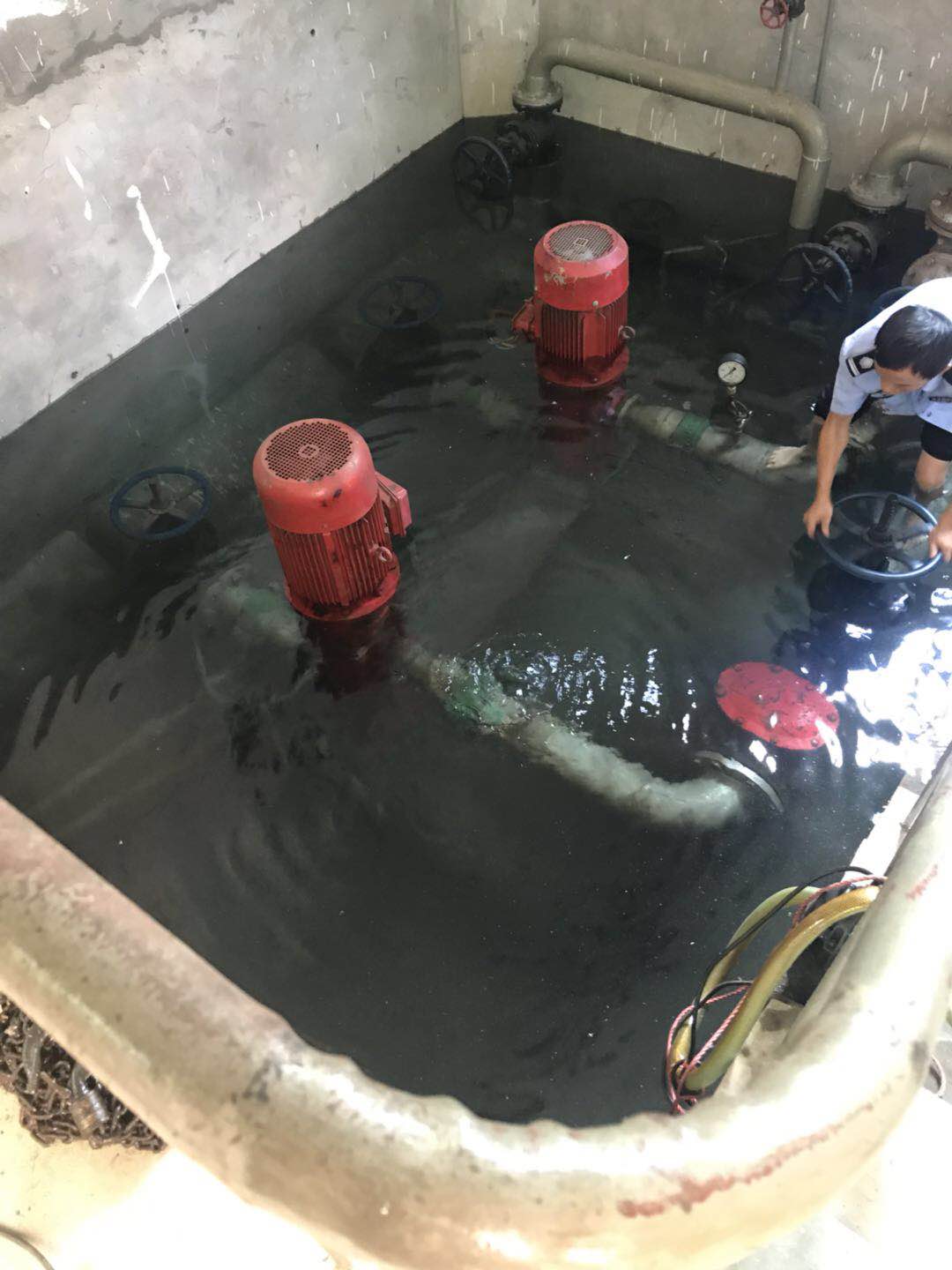 圖為執(zhí)勤隊員在關(guān)閉閥門 “看,應(yīng)該是這里漏水了,有水暈在動。” “對,就是這里了。” “水馬上要沒到電機了,趕快關(guān)閉閥門,不然損失就大了?!?/span> 此時,陳旦平?jīng)]有多想,立即下水去關(guān)閉水泵閥門。池中有2號泵的高位水池閥門和2號泵的集水池閥門,每個泵各有兩個閥門。陳旦平在迅速關(guān)閉閥門后,由于集水池這邊地勢較低,慌忙中的他忘拿手機,手機被水浸到,他卻依舊埋頭于搶修。 據(jù)隊長李新波說,此次“水災(zāi)”是北泵房2號泵的壓力表處水管漏水,原因是設(shè)備設(shè)施使用時間較長,水管陳舊銹蝕,抵不住水壓,導(dǎo)致水管開裂,引起漏水。 胡瑰華