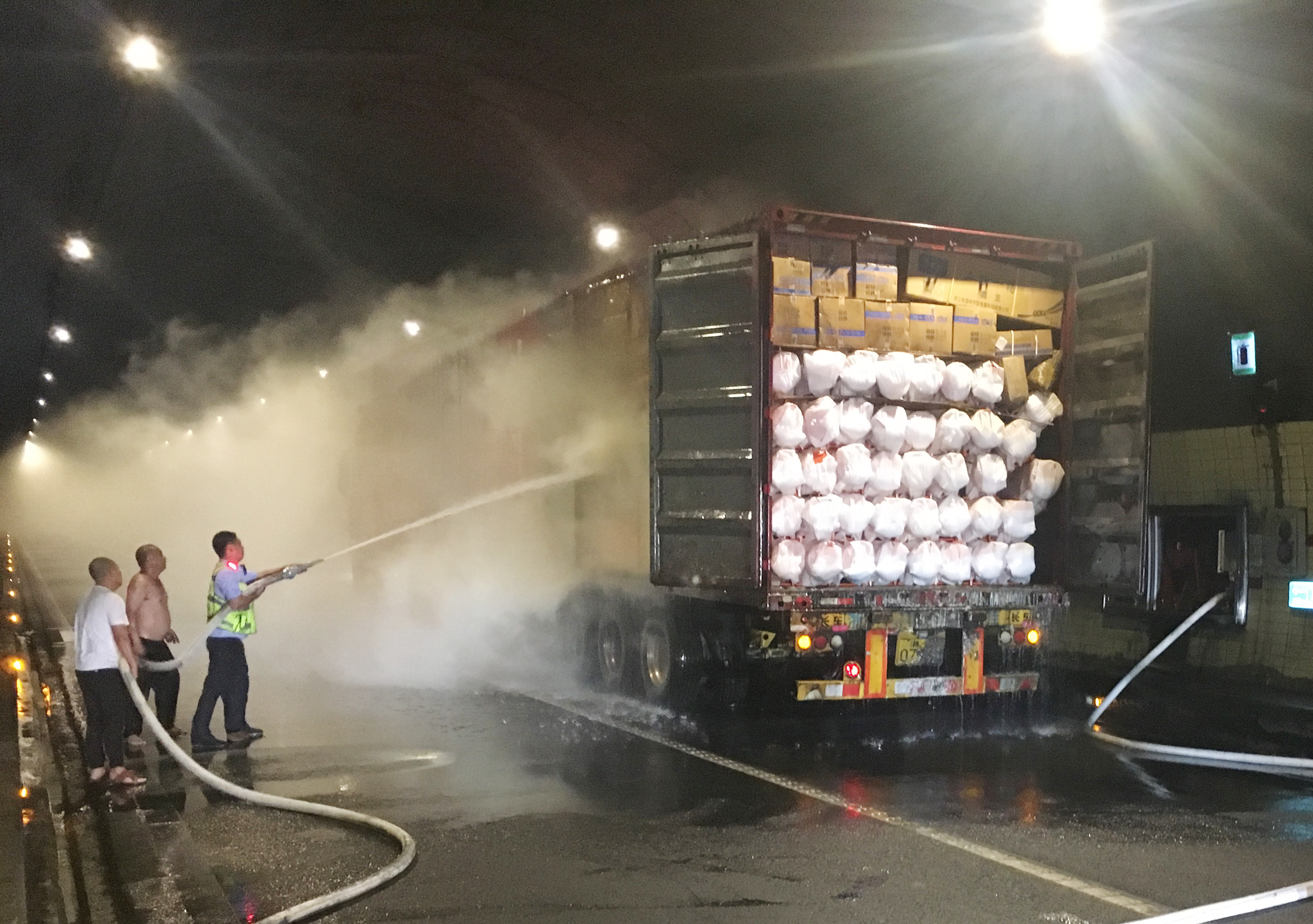 萬(wàn)幸的是,恰逢溫州高速交警巡邏車(chē)經(jīng)過(guò),隨即在該貨車(chē)后方預(yù)警,很快的所巡邏車(chē)、消防車(chē)先后到達(dá)現(xiàn)場(chǎng)協(xié)同滅火。由于該車(chē)貨物多,且裝載物皆為紙箱和塑料,集裝箱底層溫度較高,一時(shí)只能將明火撲滅,但車(chē)廂內(nèi)仍有大量煙霧,為了安全,車(chē)子必須盡快撤離隧道,執(zhí)勤隊(duì)當(dāng)即決定讓駕駛員把車(chē)開(kāi)往南廣場(chǎng)繼續(xù)滅火,消防車(chē)則一路隨其后滅火,以防火勢(shì)變大。