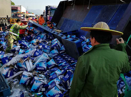 8月25日凌晨4點(diǎn),甬臺(tái)溫高速溫向1648+7路段,一輛運(yùn)啤酒的大貨車因司機(jī)疲勞駕駛,導(dǎo)致車輛撞上中央護(hù)欄而側(cè)翻,啤酒灑滿一地,后方兩輛貨車避讓不及造成多車事故。