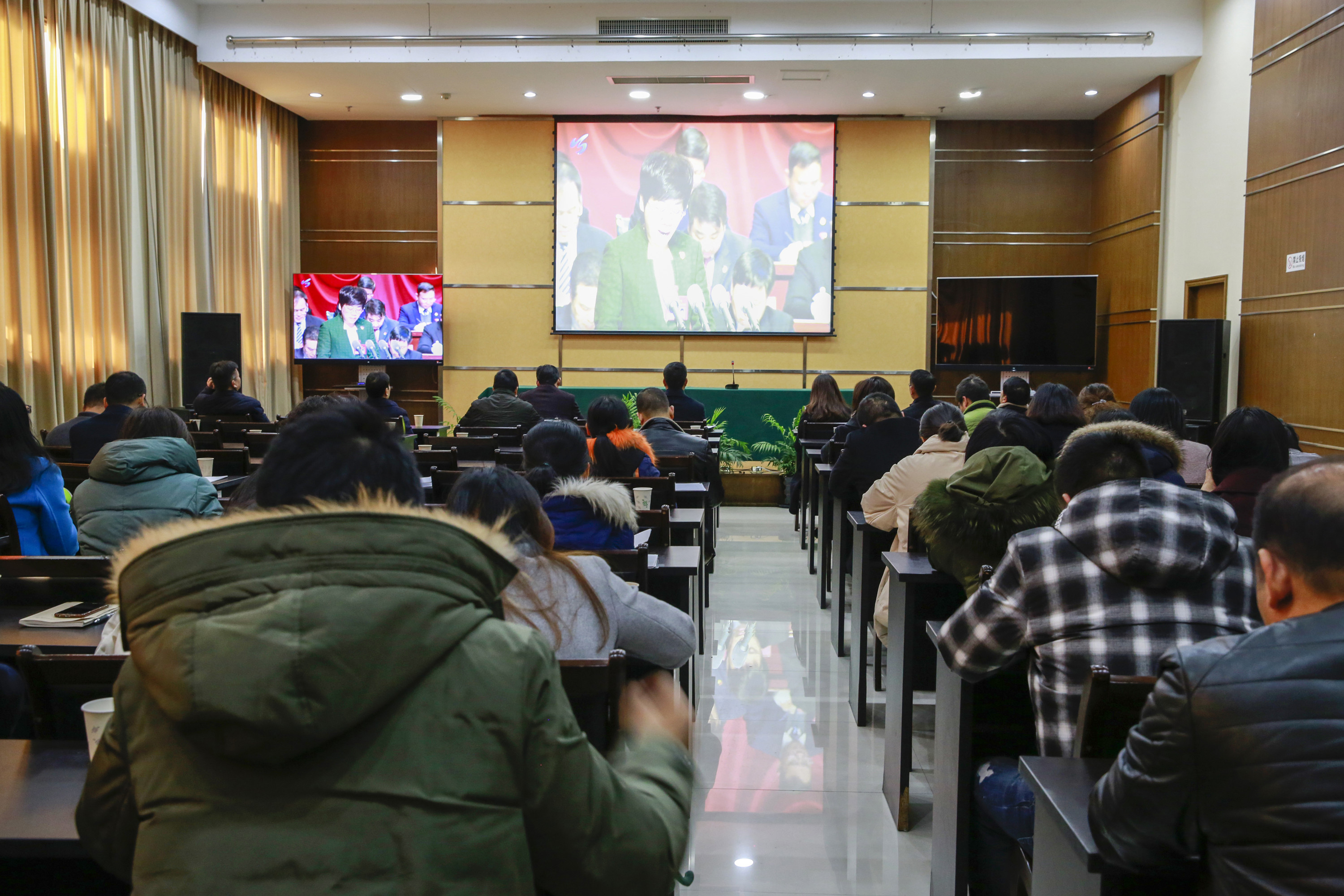 圖為集團全體干部職工收看現場