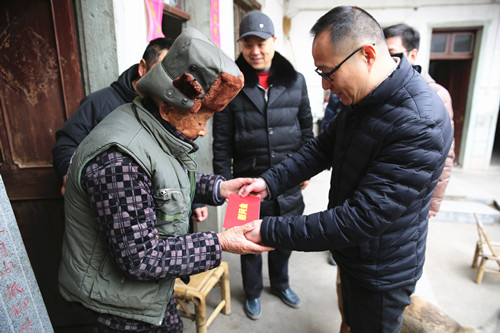 圖為集團(tuán)副總經(jīng)理羅小將慰問(wèn)村里困難群眾