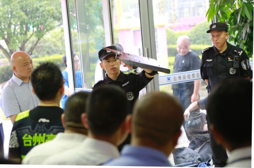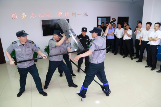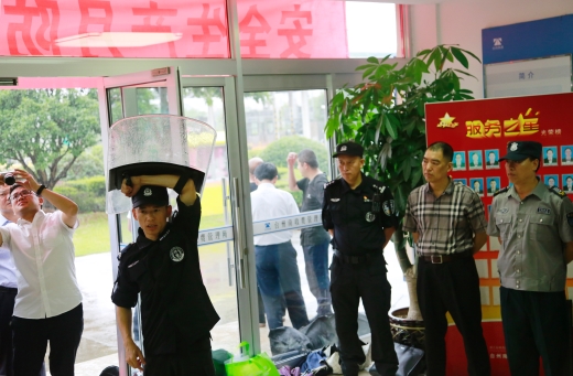 演練開始前,盧尚明對防爆盾牌、防爆鋼叉、抓捕器、警棍等各類防爆器材的功能和使用方法進(jìn)行一一講解,并示范操作,以及帶領(lǐng)大樓浙師大印象物業(yè)人員現(xiàn)場練習(xí)器械使用。