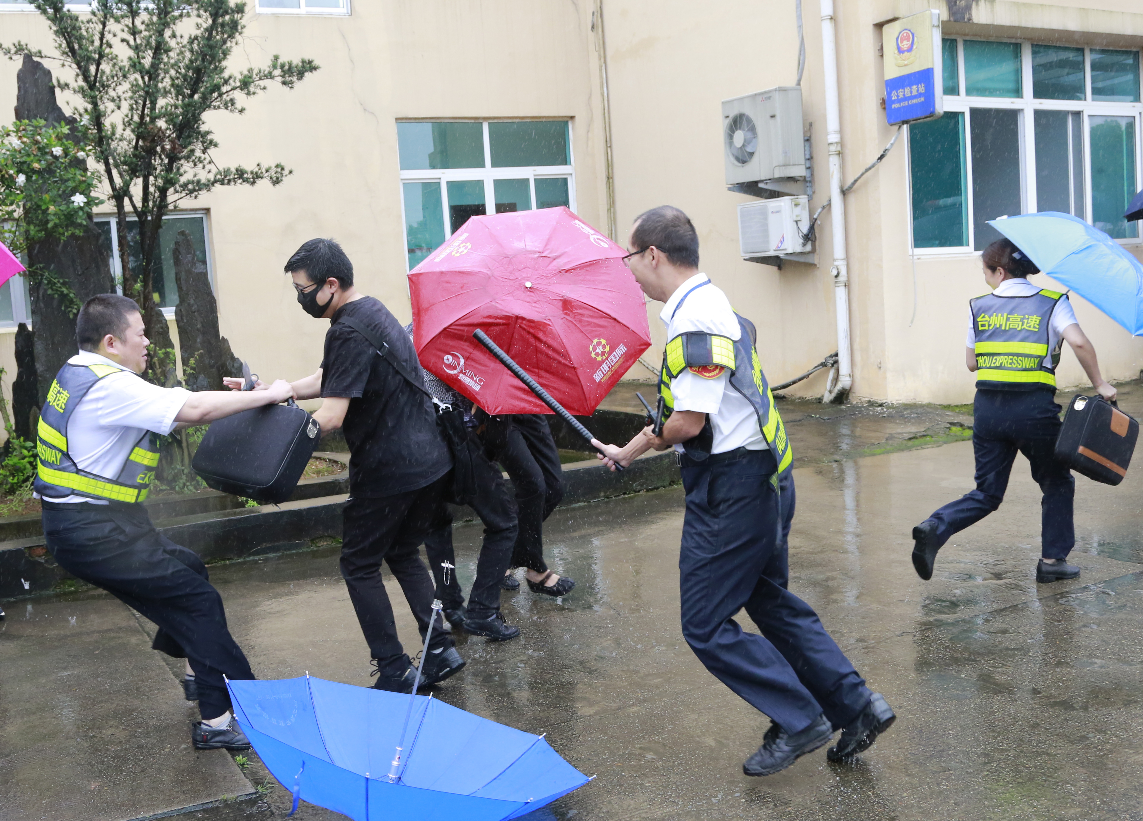 隨后,多名參演員工冒雨模擬收費崗?fù)ず土嘘犗聧徳庥觥按跬健睋尳俚那榫伴_展防盜搶演練?,F(xiàn)場,2名蒙面歹徒執(zhí)仿真刀、軟棍威脅收費員交出現(xiàn)金,危機(jī)之中,收費站立即啟動應(yīng)急處置預(yù)案并報警求助,收費員有效與歹徒周旋,應(yīng)急處置組人員迅速攜鋼叉、橡膠棒、勞動工具等赴現(xiàn)場支援,值班領(lǐng)導(dǎo)、收費班長、監(jiān)控員合力協(xié)作應(yīng)對歹徒,防盜搶演練順利結(jié)束。