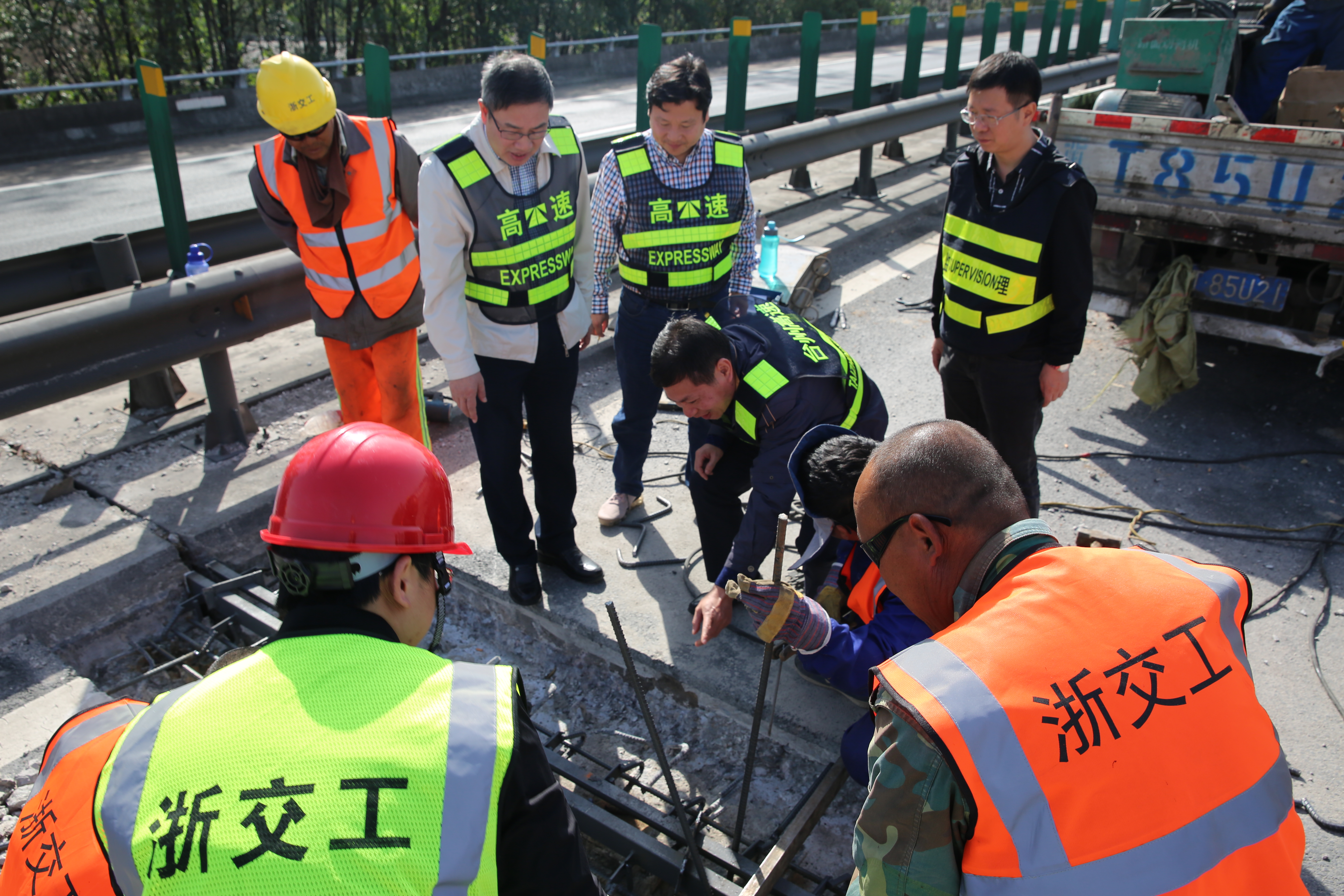 10月31日上午,臺(tái)州高速集團(tuán)董事長(zhǎng)陳文波在總工程師江輝的陪同下,趕赴甬臺(tái)溫高速公路溫州方向黃土嶺隧道、橋梁維修加固工程施工現(xiàn)場(chǎng),檢查施工進(jìn)展情況。
