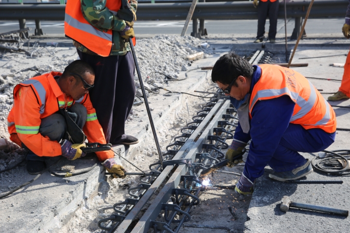 隨后,在伸縮縫型鋼安裝現(xiàn)場(chǎng),陳文波撿起鑿除的碎渣,查看被鑿除的舊伸縮縫情況。公司所轄路段屬于軟土路基,且有91座橋梁,由于運(yùn)行時(shí)間已20余年,部分橋梁伸縮縫破損較為嚴(yán)重,如何維修橋梁伸縮縫和橋頭跳一直是個(gè)老大難問(wèn)題。在橋梁伸縮縫修補(bǔ)現(xiàn)場(chǎng),因?yàn)橹剀?chē)的碾壓,部分伸縮縫已經(jīng)磨損嚴(yán)重,所在的混凝土路面只能借助鑿巖機(jī)進(jìn)行作業(yè)。