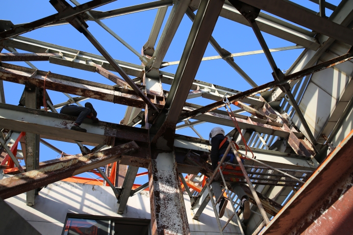 集團總部天和大廈樓頂鋼架跨度大,高低水平不一致,很難搭建大范圍的防護網(wǎng)及腳手架等施工輔助工具,也無法采用大型機械打磨除銹的方式除去表面的銹層,只能靠手工和電動角磨機除銹。施工人員常常進行高空作業(yè),安全隱患大。