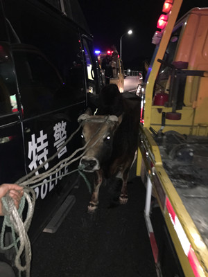 警報(bào)拉起,警燈閃爍,猛牛在施救車和巡邏車護(hù)送下,走過(guò)黃土嶺隧道,并在警車引導(dǎo)下,走向臺(tái)州收費(fèi)所出口。晚7:00時(shí)在即將出口時(shí),牛開(kāi)始受驚,四處突圍,為避免事故,飛速趕過(guò)來(lái)的臺(tái)州110特警擊中了牛蹄,制伏了開(kāi)始發(fā)瘋的牛。費(fèi)了老大力氣,特警、交警及施救人員總算合力將牛抬上施救車安全帶下了高速公路 。 據(jù)悉,這起事件由于一輛運(yùn)牛的貨車沒(méi)有做好安全措施,行駛過(guò)程中,牛逃下了車。所幸,處置到位,沒(méi)有釀成安全事故 。 鄭蔚
