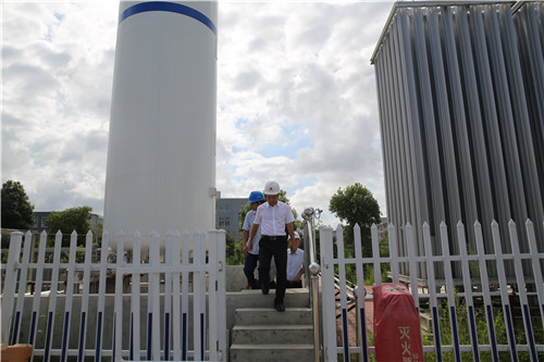 在加氣工藝區(qū),張建平一行帶上頭盔,深入到加氣站的核心區(qū)塊了解加氣站的運(yùn)行狀況,看到嶄新的設(shè)備和整潔的環(huán)境,張建平頻頻點(diǎn)頭。