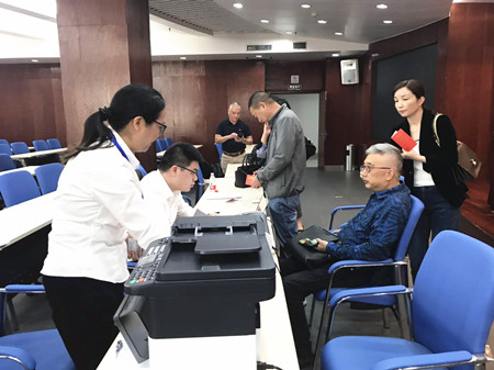 上圖為工作人員在溫嶺市政府設(shè)置流動(dòng)點(diǎn)為股東服務(wù)