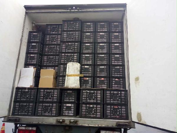 早上10點40分左右,這輛運蘋果的貨車駛?cè)胧召M站的一號崗?fù)?,司機(jī)師傅說自己運的是蘋果,根據(jù)公司規(guī)定,綠農(nóng)車檢查必須開車門檢查貨物。憑著多年的檢查經(jīng)驗,當(dāng)班班長童軍偉發(fā)現(xiàn)這輛綠農(nóng)車有問題,覺得重量遠(yuǎn)遠(yuǎn)不夠,可能不符合“綠農(nóng)”免費政策。果不其然,車廂中“深藏玄機(jī)”,左右兩側(cè)各有一排玻璃鋼魚箱,這就給檢查增加了難度。當(dāng)班班長要求司機(jī)師傅把最后兩排箱子拿掉,想檢查玻璃魚缸,然而這個司機(jī)極其不配合,還惡意刁難工作人員,說什么也不搬蘋果。