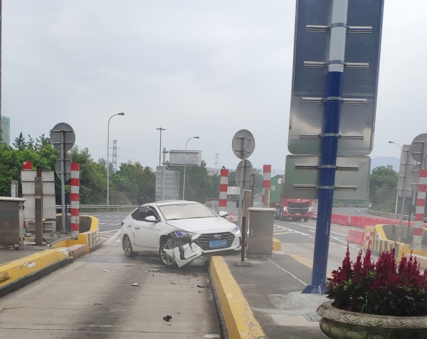9月8日上午7點(diǎn)30分,一輛白色現(xiàn)代轎車在臺州收費(fèi)所出口準(zhǔn)備進(jìn)入ETC車道時,突然撞向車道右側(cè)的全安島,在與安全島發(fā)生碰撞后,又一頭撞向了左側(cè)的安全島。