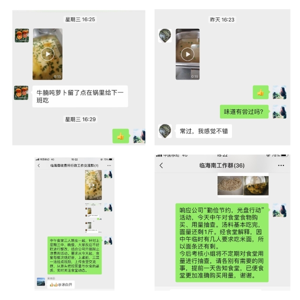 臨海南收費(fèi)所不只是單單把宣傳標(biāo)語掛在墻上,擺在桌上。更把節(jié)約舉措落實(shí)到具體行動(dòng)中。為了不浪費(fèi)食材,行政人員提前安排一周菜單,并統(tǒng)計(jì)用餐人數(shù),規(guī)劃食材數(shù)量,食堂工作人員按照人數(shù)采購(gòu)當(dāng)天食材控制成本,并將每餐燒好的菜拍成視頻上傳食堂交流群,以更好地關(guān)注食堂動(dòng)態(tài),從源頭把控菜量與伙食的品質(zhì),每周還不定期抽查食堂,查看剩余量。
