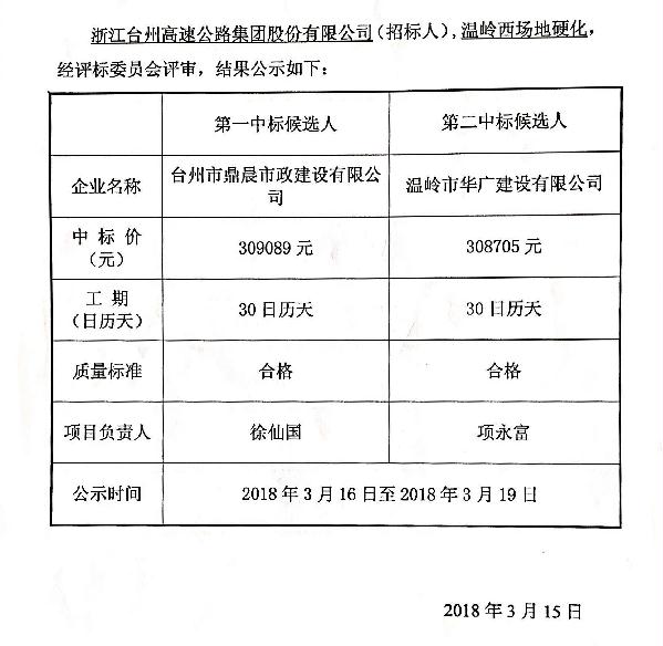溫嶺西場地硬化工程中標(biāo)候選人公示單