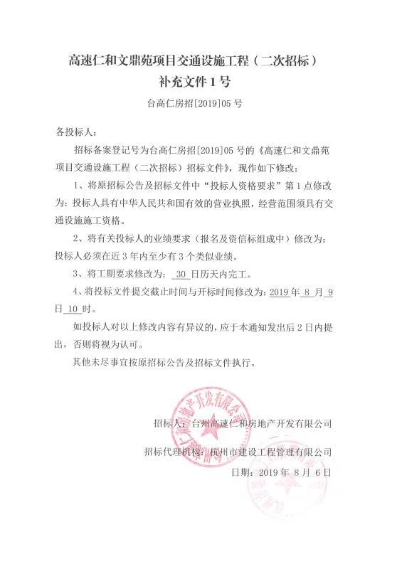 高速仁和文鼎苑項目交通設(shè)施工程(二次招標(biāo))補充文件1號