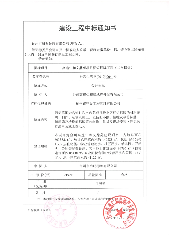 高速仁和文鼎苑項(xiàng)目標(biāo)識標(biāo)牌工程中標(biāo)通知書
