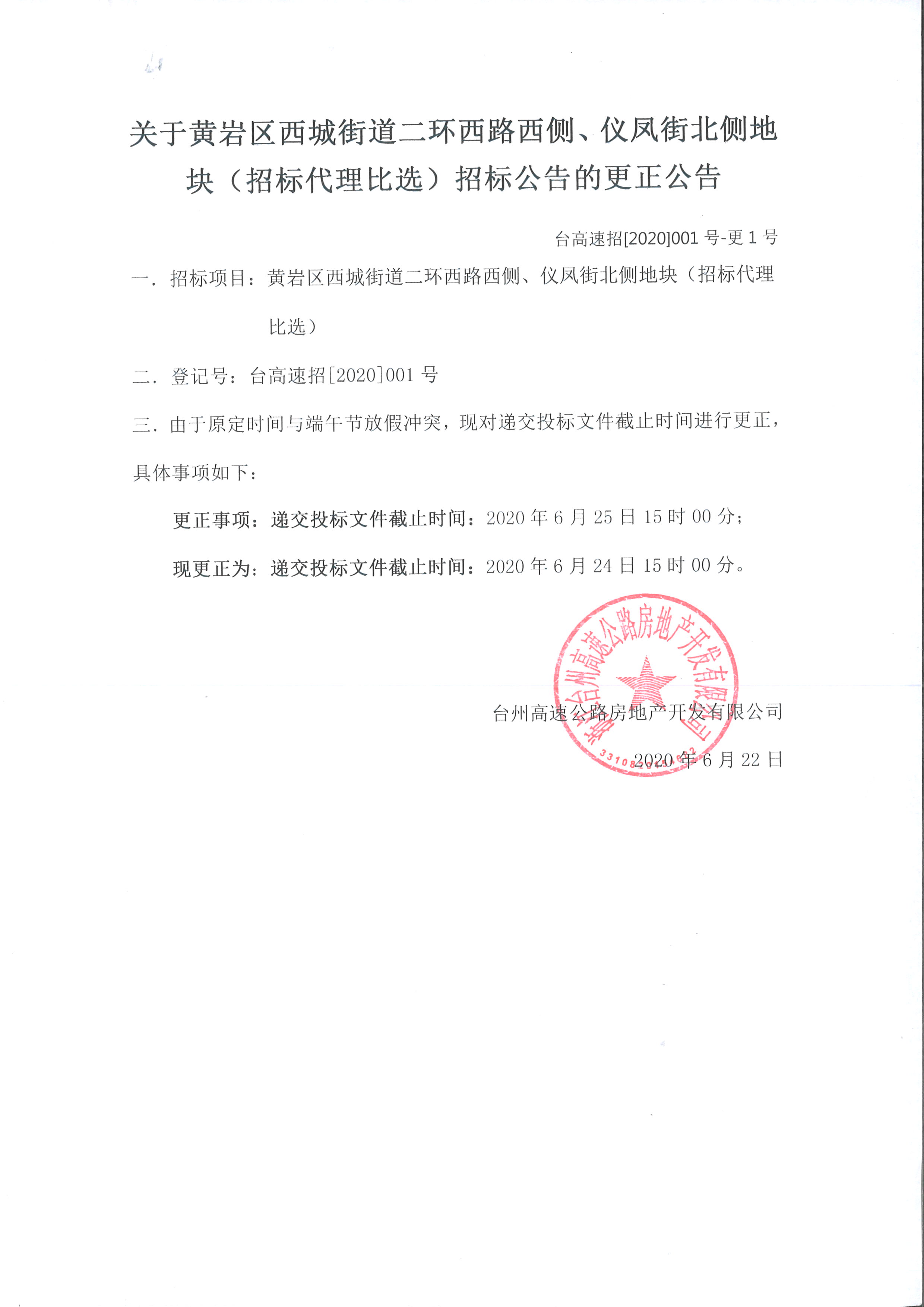 關(guān)于黃巖區(qū)西城街道二環(huán)西路西側(cè)、儀鳳街北側(cè)地塊(招標(biāo)代理比選)招標(biāo)公告的更正公告