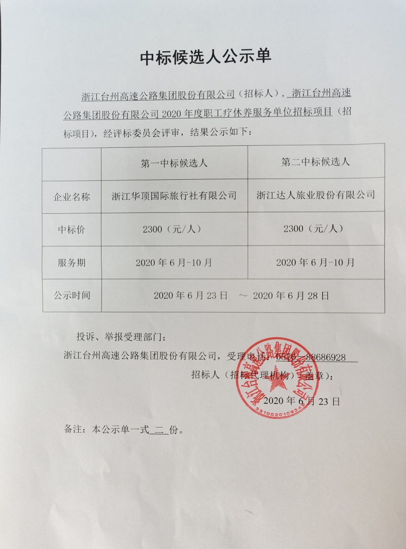 2020年度職工療休養(yǎng)服務單位招標項目中標候選人公示單