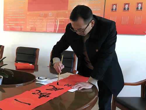 上聯(lián)“自強(qiáng)不息吉慶到”、下聯(lián)“厚德載物福運(yùn)來”,橫批“喜迎新春”,個個遒勁有力的大字從筆尖輕快地躍出,行云流水的書法讓在場人員無不拍手叫好。所長孫明偉亮出絕活,揮毫潑墨,豪邁大氣地?fù)]寫著一幅幅春聯(lián)。