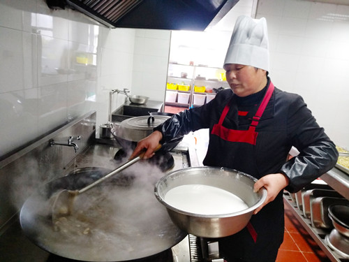 浸了一夜的早米,用石磨磨成米漿,細(xì)膩而幼滑,被靜置在盆里?!耙话愣加妹追叟菟诟写植?,而且吃起來沒有香頭?!崩ㄒ贿呎f,一邊將香腸切碎與豆腐、冬筍、胡蘿卜、芹菜、香菇、蠶豆瓣翻炒著。旁邊的大鍋里,長長的豆面在骨頭湯里翻滾著,像一棵棵舞蹈的海草。徐徐倒入的米漿,被不停地?cái)嚢瑁耙钦车藉?,就會有焦糊味,這鍋羹就算廢了?!泵诐{好像不夠,利花有些懊惱,“要是在家里,米漿都會多準(zhǔn)備一些,不夠就隨手添,我?guī)У竭@里就這些,也沒得加了?!本徒性谝贿呑鰩褪值拿妹脤毣ㄓ妹娣酆蜕椒郏ㄒ簿褪欠矸郏剿杵饋恚谷脲伬?,湯漸漸濃稠起來,倒入之前炒好的配料,加上切得細(xì)細(xì)的綠綠的芥菜梗、芥菜葉、海蠣,鍋里不時(shí)冒起大泡,香氣四溢。 為照顧吃不慣糟羹的同事,食堂還準(zhǔn)備了一鍋甜的山粉糊。來自臺州各縣市區(qū)的同事,按各自飲食習(xí)慣選擇了咸的或甜的。有說芹菜的味道蓋過了芥菜清香的,有說沒有加入芋頭口感不夠糊的,但撲鼻的香氣和濃厚豐富的口感立刻讓人忘了挑剔。對我來說,碧綠的芥菜葉和白胖的海蠣肉是整碗羹的顏值擔(dān)當(dāng)和靈魂所在。 每個(gè)元宵節(jié),對于在崗的同事們是沒有花燈可看、沒有燈謎可猜的,也不能與家人聚在一起吃羹。車道上此刻正是流量高峰期,大家匆匆吃完,都要趕著上崗。食堂大姐把多出的糟羹和山粉糊放進(jìn)蒸飯鍋保溫,叮囑大家下班后再來吃點(diǎn),這個(gè)吃了不扛餓。此時(shí),除了食物最能體現(xiàn)節(jié)日氣氛外,還有那一份特意為你留著的溫?zé)岣屓烁袆印?/span> 鄭瑛芝
