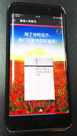 “凝視黨旗,我把奉獻(xiàn)刻心里;舉起右拳,我把責(zé)任刻心里;宣讀誓言見證我對(duì)黨的忠誠;這崇高的選擇是我終身的信仰----”點(diǎn)開微信圖文信息,伴隨著低沉渾厚的男聲詩朗誦,接收到信息的黨員們不由肅然起敬,仿佛置身當(dāng)年黨旗下宣誓的莊嚴(yán)時(shí)刻。