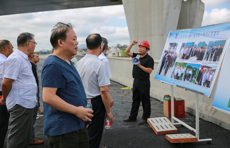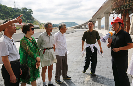圖為在6#立交上了解工程建設(shè)情況 老干部一行實(shí)地踏勘了內(nèi)環(huán)路(黃巖段)各施工現(xiàn)場(chǎng),全面了解了四個(gè)標(biāo)段工程當(dāng)前建設(shè)情況。一路上,老干部們一面聽(tīng)取各標(biāo)段工作匯報(bào),一面用手機(jī)相機(jī)記錄現(xiàn)場(chǎng)當(dāng)前建設(shè)情況,當(dāng)知道今年11月11日內(nèi)環(huán)路將實(shí)現(xiàn)主線通車(chē)時(shí),老干部們紛紛豎起大拇指,為內(nèi)環(huán)路建設(shè)的進(jìn)度和質(zhì)量點(diǎn)贊,同時(shí)表示將多走多看,為內(nèi)環(huán)建設(shè)盡自己的一份力。 鐘彪對(duì)老干部們的關(guān)心和支持表示衷心感謝,并希望各位老干部多指導(dǎo)、多監(jiān)督、多提寶貴意見(jiàn),助力臺(tái)州城市建設(shè)趕超發(fā)展。 張琛