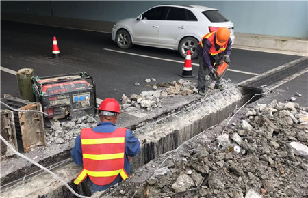 圖為施工現(xiàn)場 臺州市內(nèi)環(huán)路(10+170~8#立交)工程于2018年3月10日竣工驗(yàn)收,目前處于兩年的保修期范圍內(nèi),由于框架橋的結(jié)構(gòu)特性和當(dāng)?shù)氐牡鼗攸c(diǎn),站西大道下穿跳車的問題一直無法得到有效解決,而這也成了影響內(nèi)環(huán)路行車舒適度的首要問題之一。早在2018年6月12日,市政公司就組織施工單位對當(dāng)時(shí)的路面進(jìn)行了銑刨后重鋪瀝青路面的施工處理,但是經(jīng)過9個(gè)月的運(yùn)行沉降后,橋頭跳車問題再次出現(xiàn)。本著有險(xiǎn)必修,有錯(cuò)必究的原則,市政公司再次組織施工單位對該段路面的維修問題進(jìn)行了現(xiàn)場論證,根據(jù)論證結(jié)果進(jìn)行了修復(fù)性施工。